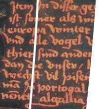 Ein inhaltlich identischer Vermerk im Nachlass des fränkischen Globenmachers Johannes Schöner [1477-1547] - der die Benutzung des Behaim-Globus als Quelle nahelegt - bezieht den Text ausdrücklich auf die nahe der Legende liegende Insule martini.